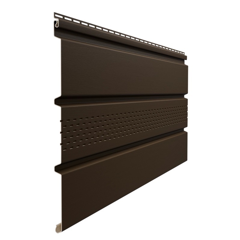Софит Docke с центральной перфорацией может быть использован для оформления выносных карнизов, при отделке летних кухонь, открытых террас, веранд и прочих конструкций, нуждающихся в постоянном притоке воздуха и вентилировании. Как правило, цвет софита подбирается в тон кровле для придания конструкции гармоничного внешнего вида.