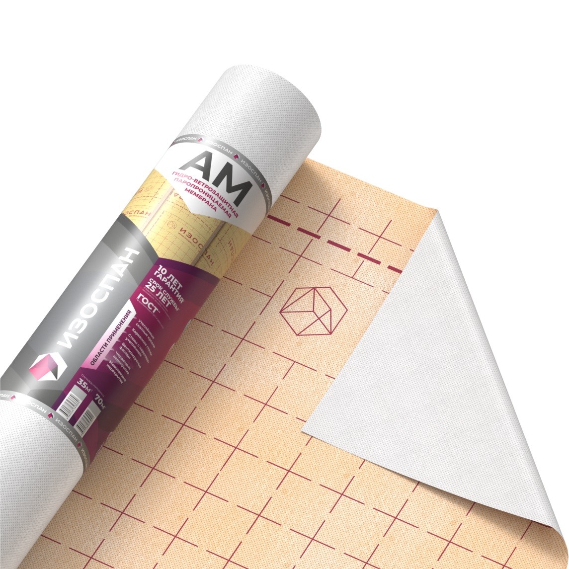 ИЗОСПАН АМ - гидро-ветрозащитный паропроницаемый материал, выполненный из полимерной микропористой мембраны, усиленной с двух сторон полипропиленовым нетканым полотном.