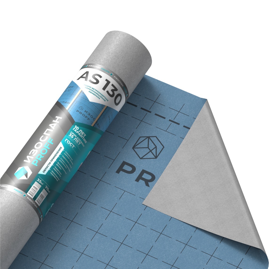 ИЗОСПАН АS 130 - гидро-ветрозащитный паропроницаемый материал выполненный из полимерной микропористой мембраны, усиленной с двух сторон полипропиленовым нетканым полотном.