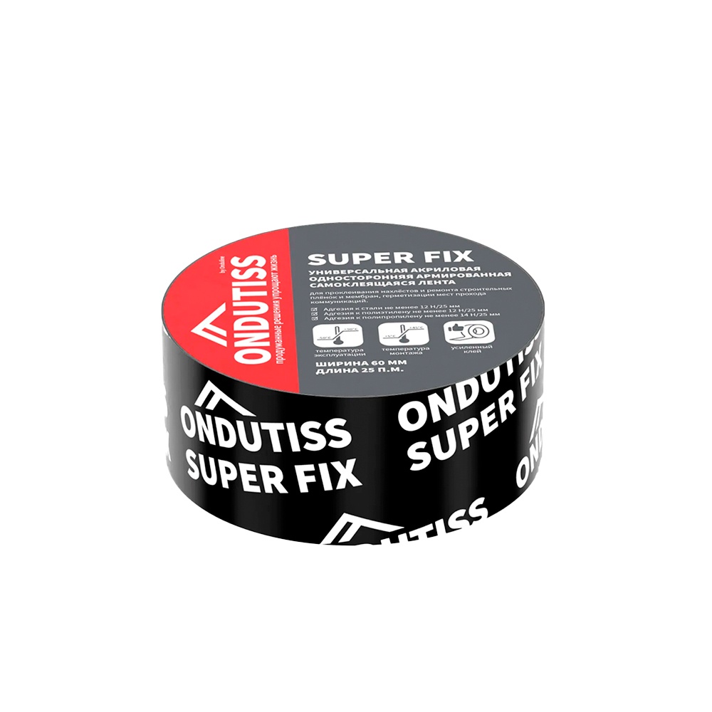 ONDUTISS Super Fix - это универсальная акриловая, односторонняя, армированная самоклеящаяся лента, использующаяся при проклеивании нахлёстов и ремонте строительных плёнок и мембран. Также лента применяется для герметизации мест прохода коммуникаций. ONDUTISS Super Fix обладает хорошей адгезией, в течение длительного срока обеспечивает надёжное паро-воздухонепроницаемое соединение.