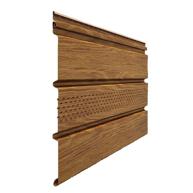 Софит Docke с центральной перфорацией может быть использован для оформления выносных карнизов, при отделке летних кухонь, открытых террас, веранд и прочих конструкций, нуждающихся в постоянном притоке воздуха и вентилировании. Как правило, цвет софита подбирается в тон кровле для придания конструкции гармоничного внешнего вида.