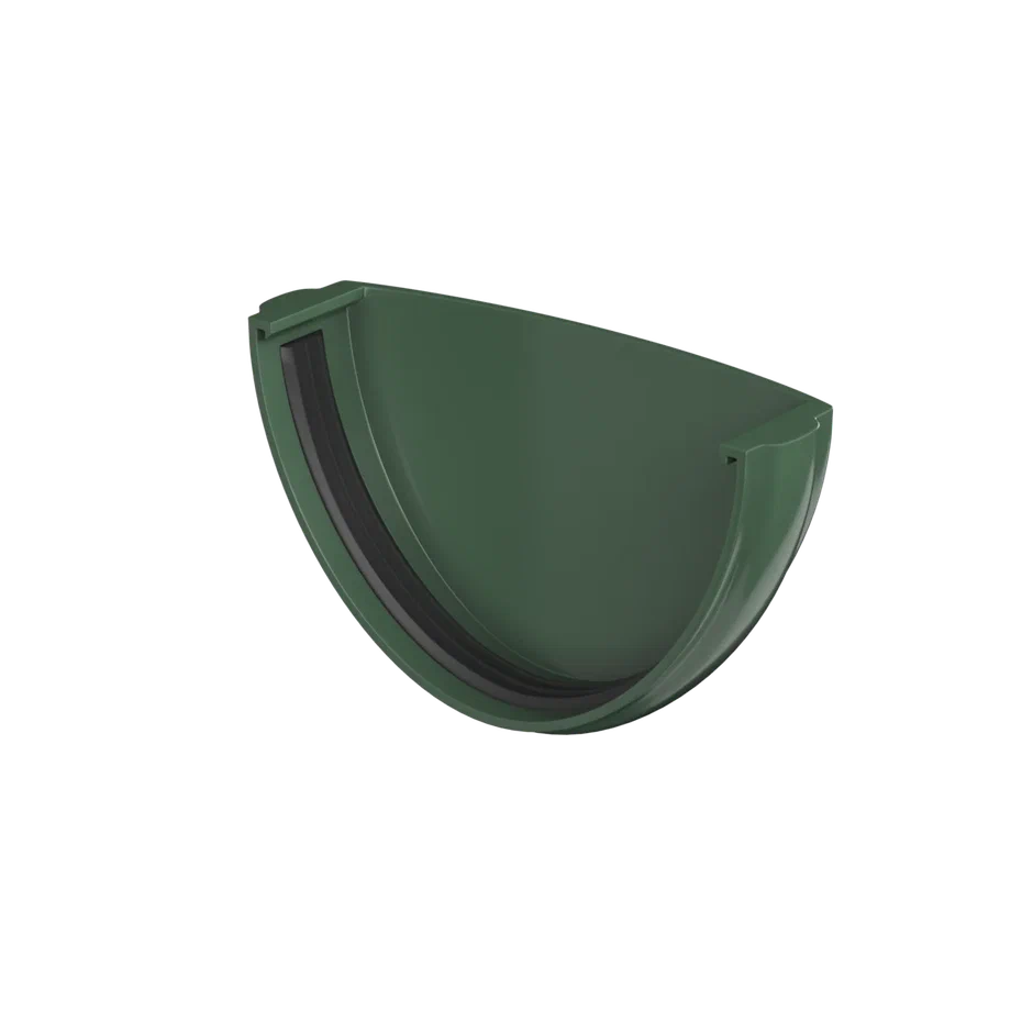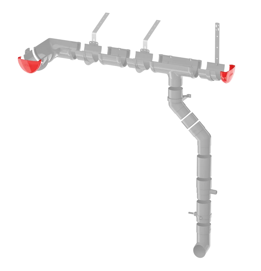 Желоб заглушки закрывает концы желоба и помогает воде стекать в направлении наклона к воронке. Эта конструкция обеспечивает надежную фиксацию, водонепроницаемость и прочность желоба. Заглушки являются универсальными и могут использоваться с обеих сторон.