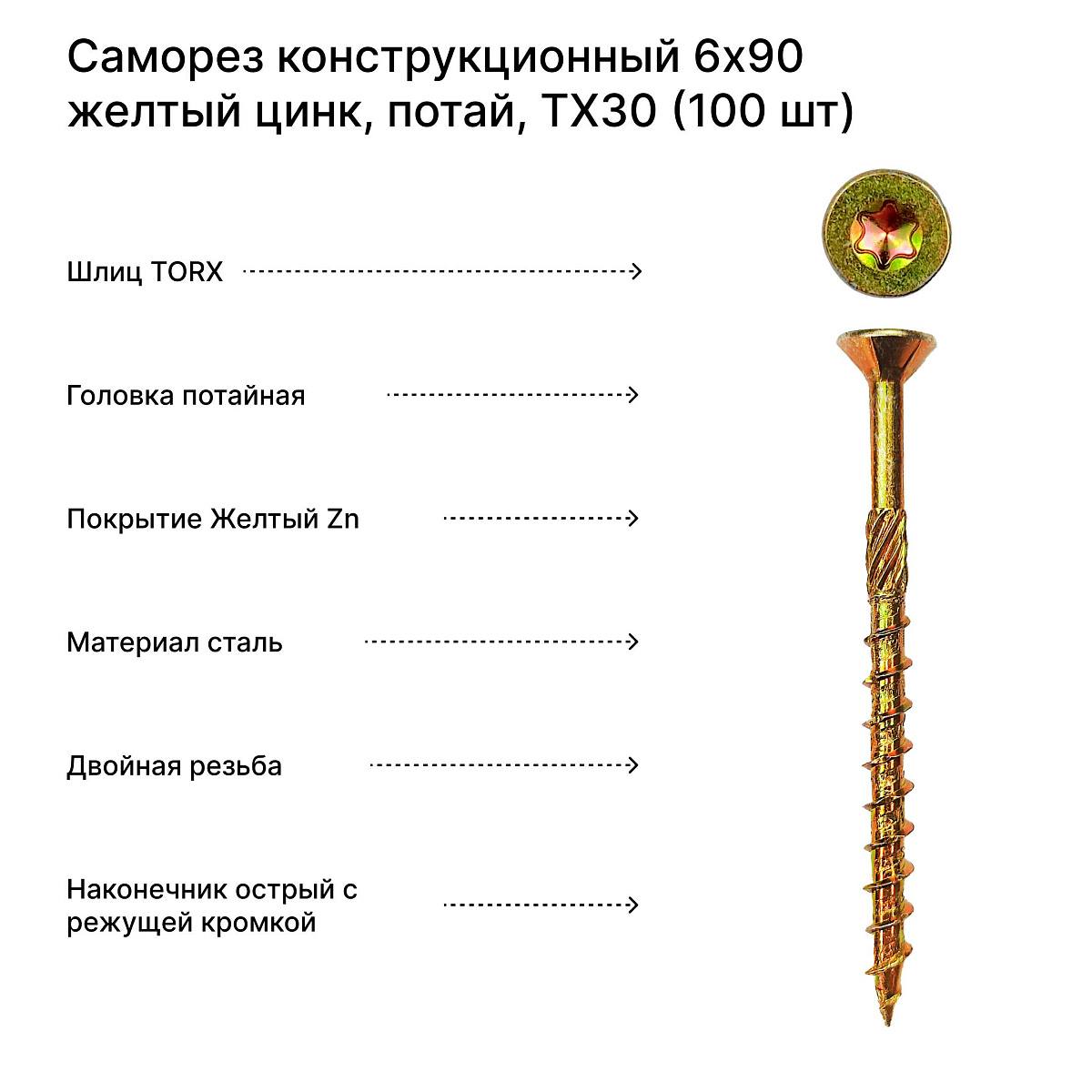 Саморез конструкционный 6x90 желтый цинк, потай, TX30 (100 шт)