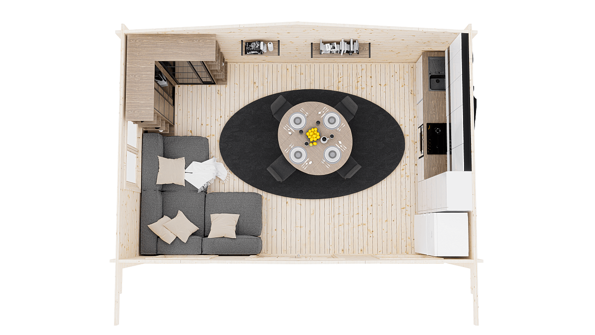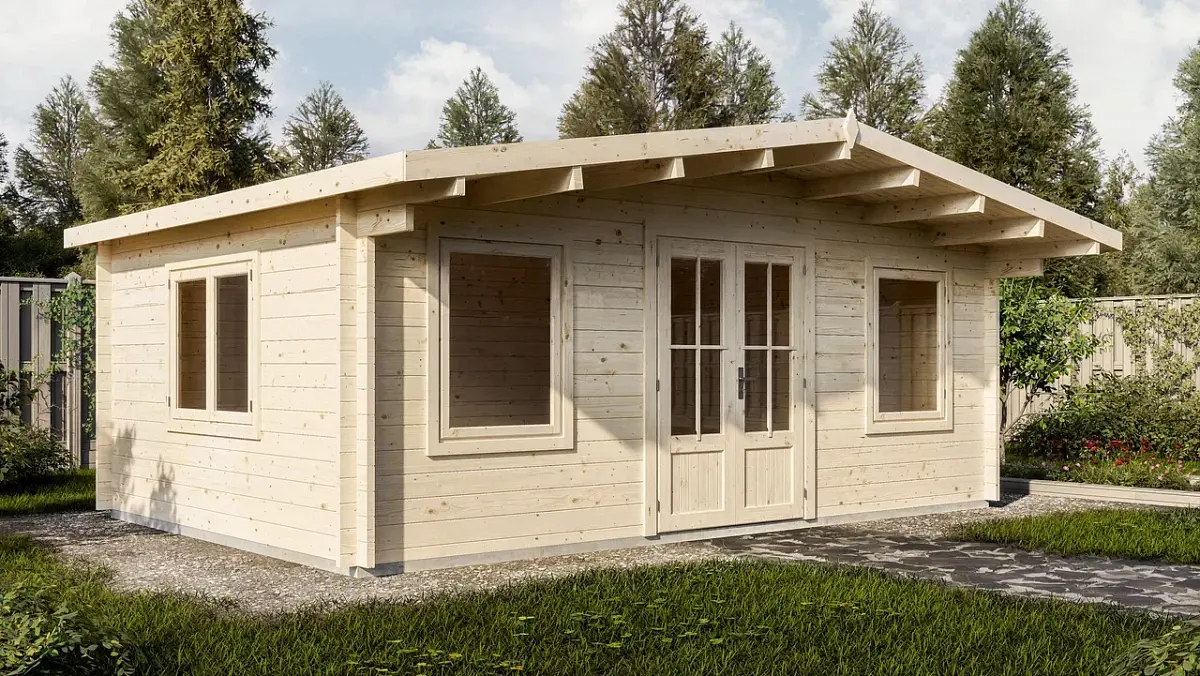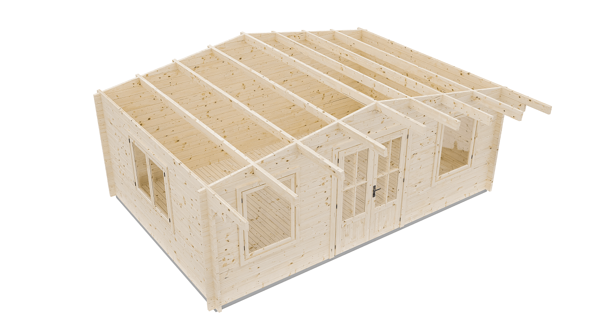 кухню, гостевую комнату или мастерскую. Широкий свес над входной группой создает дополнительную защиту от непогоды.